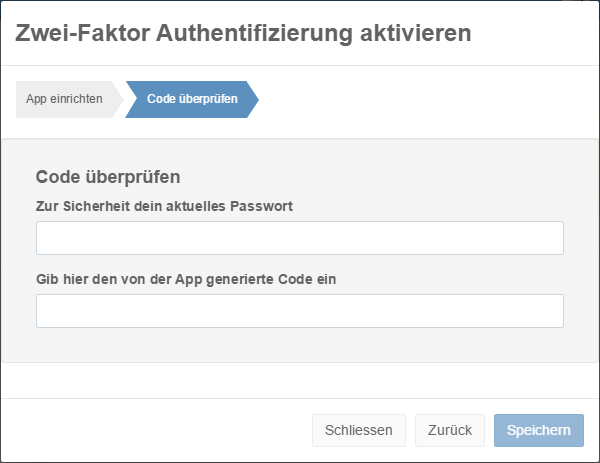 Im zweiten Schritt wird der Benutzer aufgefordert, den vom App generierten Code einzugeben. Zusätzlich frage ich hier noch nach dem Passwort des Benutzers. Damit verhindere ich, dass jemand anders böswillig 2FA aktiviert.