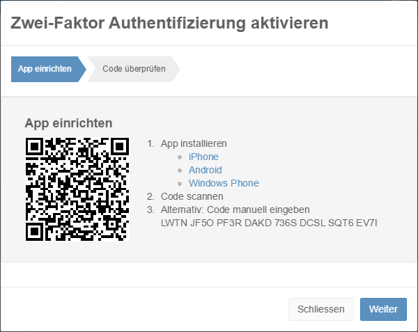 Möglicherweise ist der Benutzer nicht in der Lage, den QR Code zu scannen. Der Code sollte daher auch als Text angezeigt werden.